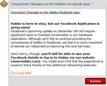 When Habbo began their affiliation with Facebook, you could play the Habbo "Facebook App" directly on Facebook's site. However, it was announced that on December 5, 2012, this service would be ending due to technical issues.